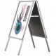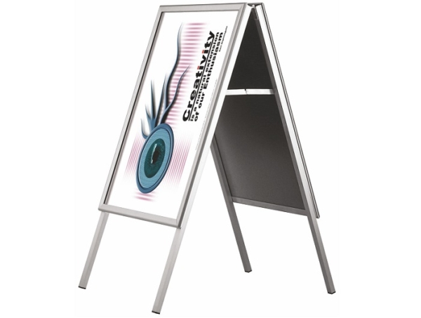 Kültéri, kétoldalas “A” alakú megállító tábla stabil konstrukcióval, fém hátlappal. A termék tükröződésmentes matt felületű PET előlappal rendelkezik a plakátok védelme érdekében. Egyszerű mozdulattal cserélhető benne a grafika. A plakátot a keretet kinyitva helyezhetjük be az előlap alá. Keret vastagsága: 25 mm.